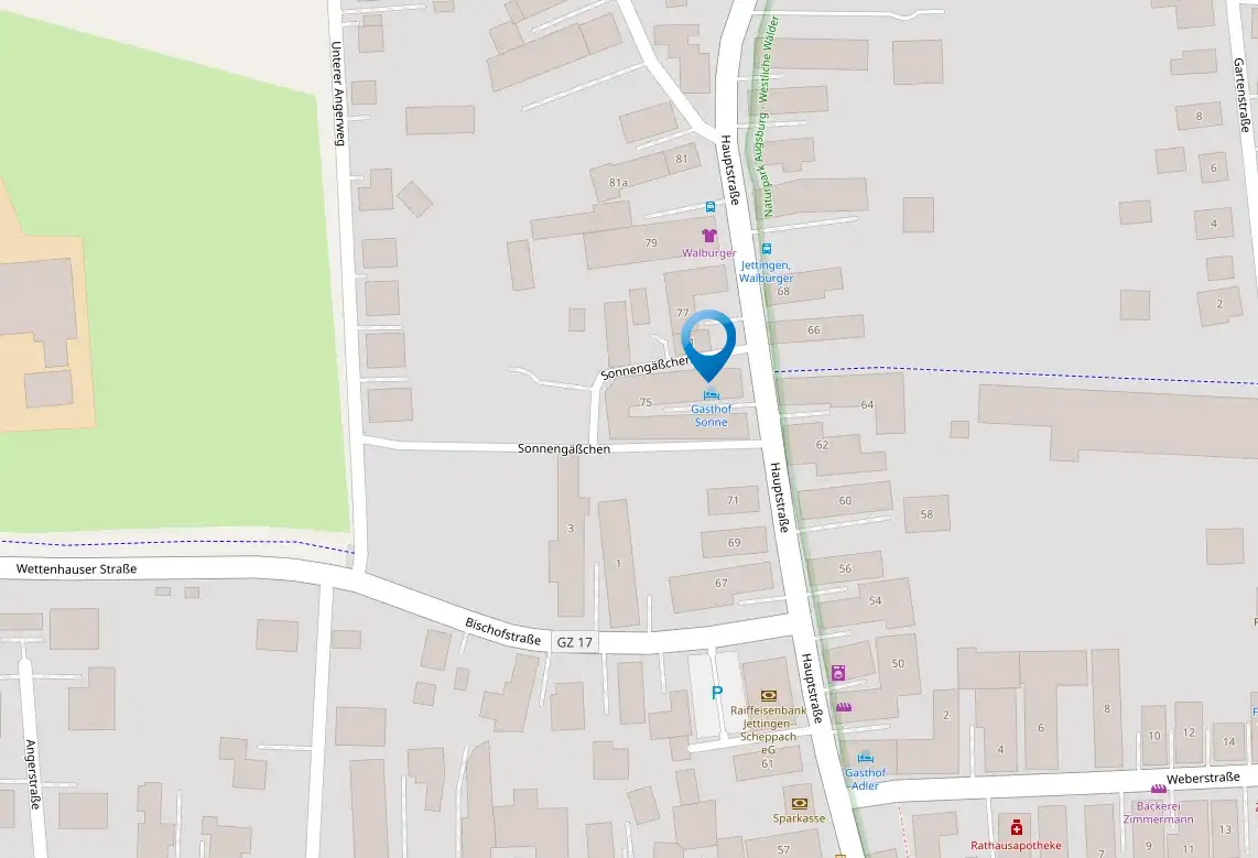 From the A8 motorway (Munich–Stuttgart), take exit Günzburg (exit 74). Follow the B16 towards Jettingen-Scheppach. In the town centre of Jettingen-Scheppach, follow the Hauptstraße – Gasthof zur Sonne is located at Hauptstraße 75 and is well signposted. The drive from the motorway takes approximately 10 minutes.